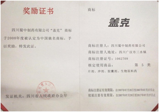 公司高度重视品牌战略,依法注册了“盖克”、“蜀中”、“三星堆”、“阿莫锋”、“益善源”、“蓉通”、“人生就是博”等108件注册商标,1999年“盖克”、2003年“蜀中”、2007年“三星堆”被认定为德阳市知名商标,2001年“盖克”、2004年“蜀中”被认定为四川省著名商标, 2008年“盖克”商标被国家工商行政管理总局认定为“中国驰名商标”。2017年3月,公司盖克牌、人生就是博牌阿莫西林胶囊和多酶片被四川省人民政府授予四川名牌产品称号。2016年,公司实现营业收入66373万元,利税7600万元;2017年,公司实现营业收入75045万元,利税7572万元。公司2017年被命名为德阳市第七批院士专家工作站,2016-2018连续三年被德阳市人民政府确定为重点龙头企业。