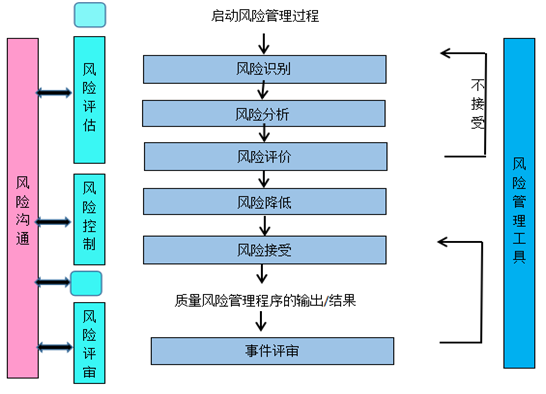 ⑷风险评估与风险控制:风险小组应用风险评估工具,如流程图、图形分析、鱼骨图、检查例表等对风险项目进行评估,评估对产品质量的潜在影响,制定风险控制措施,明确降低风险的方法,降低风险至可接受水平。常采用的风险管理工具包括:风险排列和过滤、事先危害源分析、失败模式效果分析、危害分析及主要控制点和过失树分析。